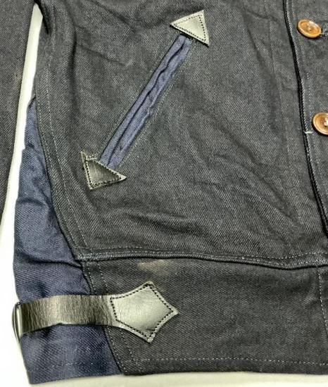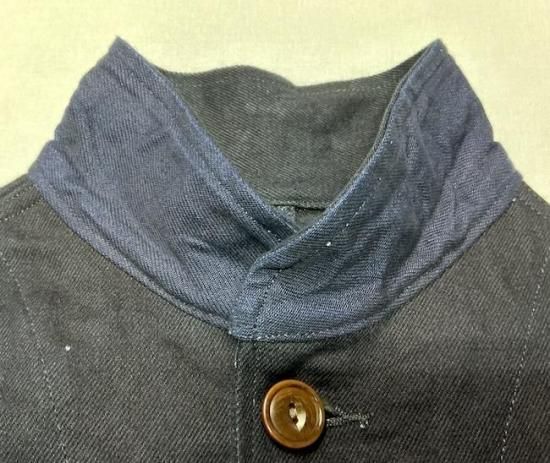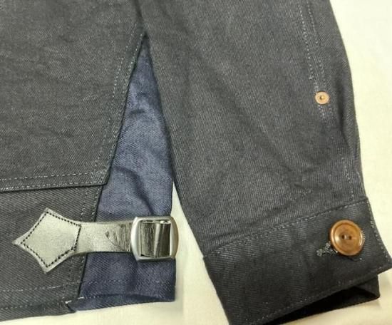 スタイルは30s、コサックジャケットを踏襲。襟は30sらしいショールカラースタイル。 襟裏はトーンの違うライトオンスデニムを使用。 木目の美しい大型ネコ目ナットボタンが漆黒のミッドナイトデニムに抜群の相性。